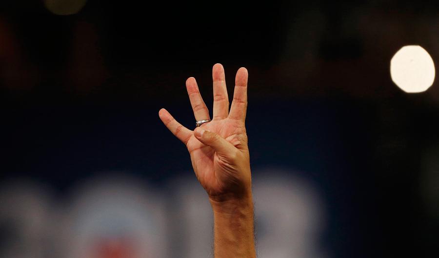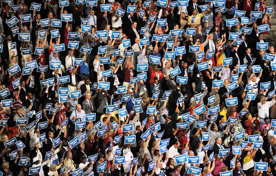 Read moreDelegates hold up signs reading "Thank You" in the midst of a convention segment on U.S. veterans during the final session of the Democratic National Convention, on September 6, 2012. #