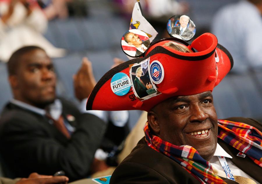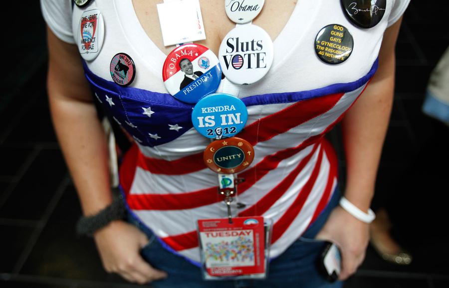Read moreCovered with stickers, Washington state delegate Chris Porter waits in line at a concession stand at the Democratic National Convention in Charlotte, North Carolina, on September 6, 2012. #