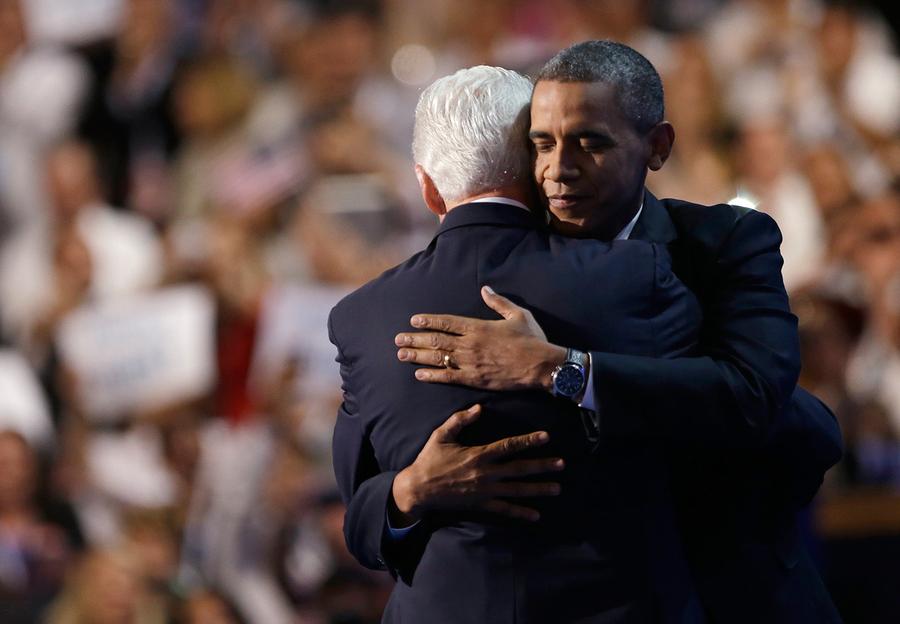 Read moreFormer President Bill Clinton bows as President Barack Obama walks on stage after Clinton's address to the Democratic National Convention in Charlotte, on September 5, 2012. #