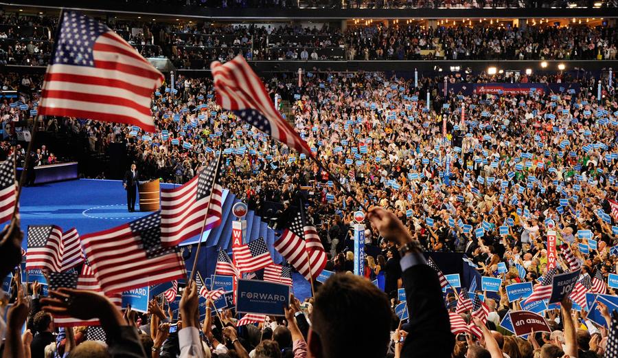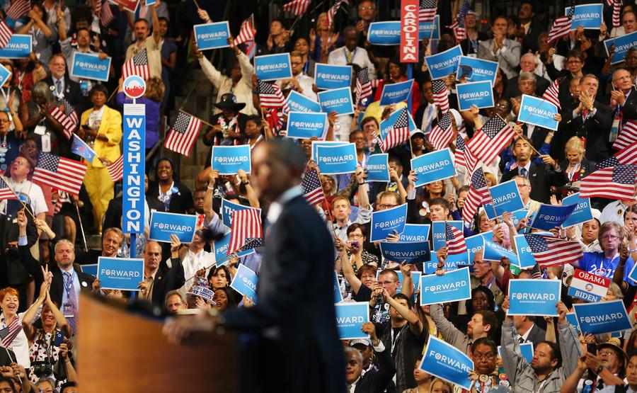Read morePeople wave American flags as Democratic presidential candidate, U.S. President Barack Obama takes the stage to accept the nomination for president in the Time Warner Cable Arena in Charlotte, on September 6, 2012. #