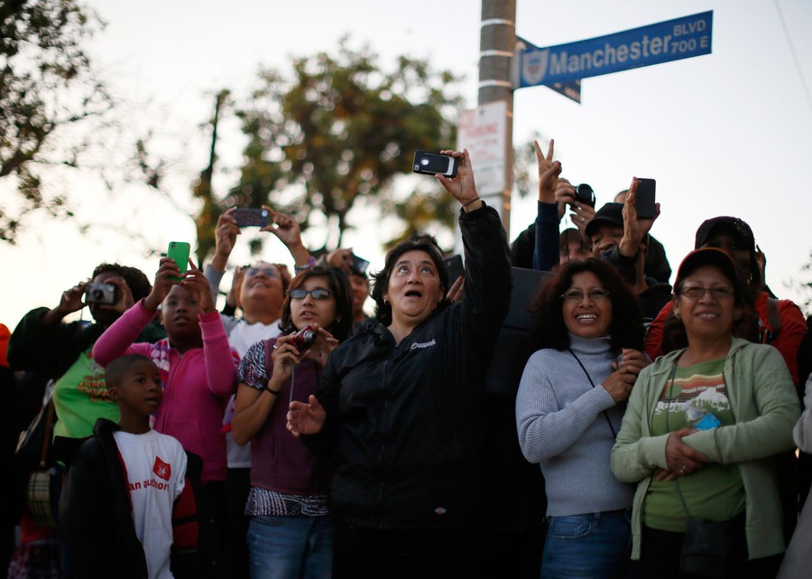 Read moreCrowds of people watch as Endeavour is transported on Manchester Blvd. while being moved to its retirement home at the California Science Center in Exposition Park, on October 12, 2012. #