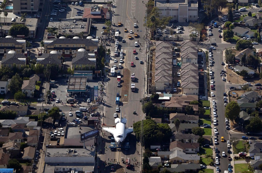 Read moreThe space shuttle Endeavour sits in a strip mall as a Hawaiian Airlines jet approaches a runway at Los Angeles International Airport in Los Angeles, on October 12, 2012. #