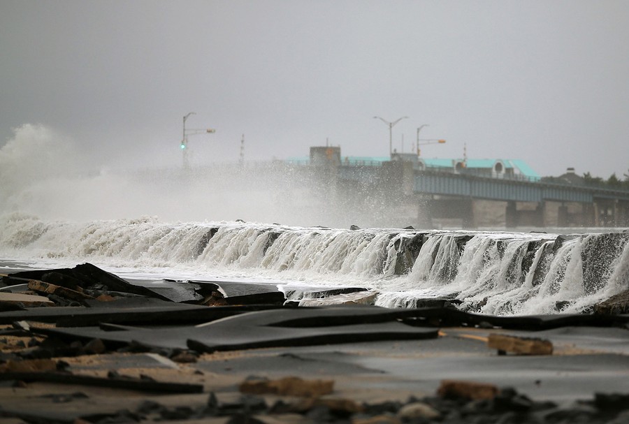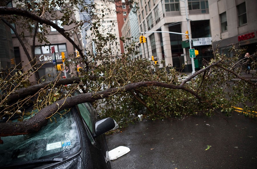 Last night, Hurricane Sandy -- the largest Atlantic tropical system on record -- made landfall just south of Atlantic City, New Jersey, bringing winds up to 90 mph (150 kph), and pushing a massive storm surge onto beaches and shorelines. At least 12 deaths have been reported in the United States. These fatalities, when added to the previous toll in the Caribbean, leave Sandy responsible for more taking more than 80 lives to date. Millions across the Eastern Seaboard are now without power, and even more are struggling with rising floodwater. Sandy continues northward, now downgraded to a post-tropical cyclone, and those affected are now assessing the damage. Collected here are images of Sandy's aftermath, many from New York City, which suffered widespread blackouts and a record-setting high tide early this morning. See also yesterday's entry: Hurricane Sandy in Photos.