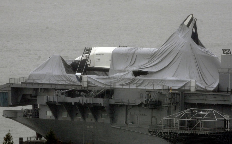 Read moreThe space shuttle Enterprise is draped with torn fabric that had protected it before Sandy passed though, leaving the spacecraft shrouded on the deck of the Intrepid Sea, Air & Space Museum, on the Hudson River in New York, on October 30, 2012. #