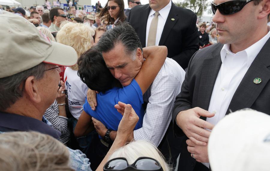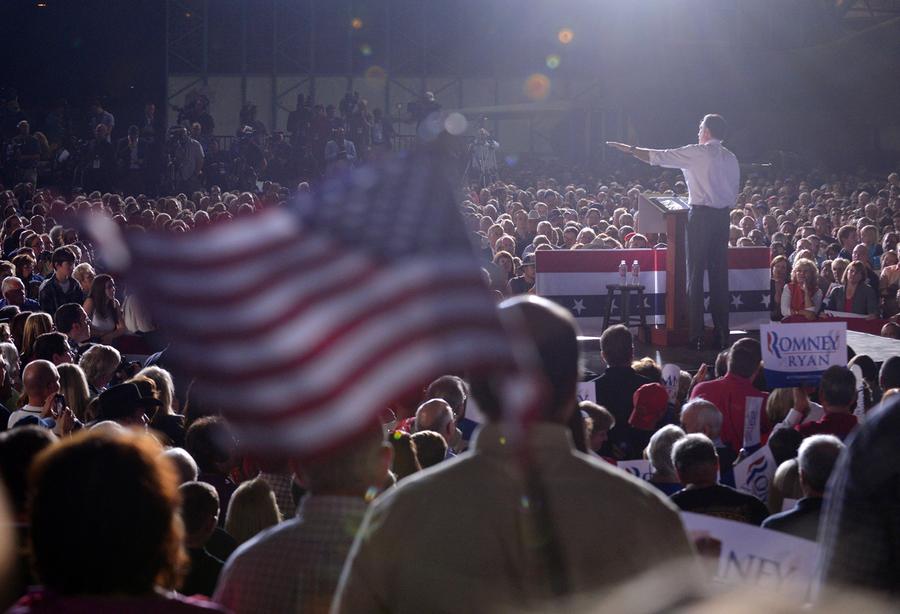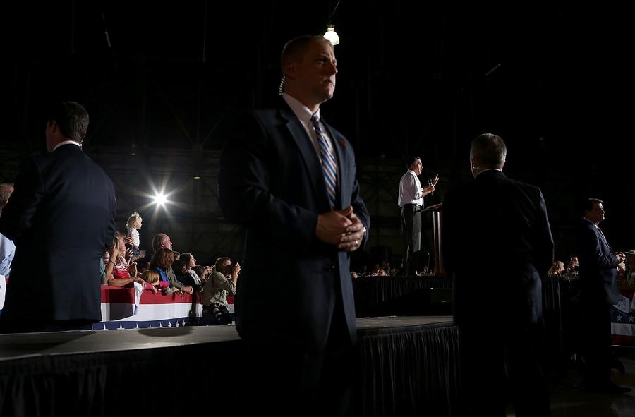 Read moreMitt Romney is surrounded by US Secret Service agents as he speaks during a campaign rally at the Wings Over the Rockies Air and Space Museum on October 1, 2012 in Denver, Colorado. #