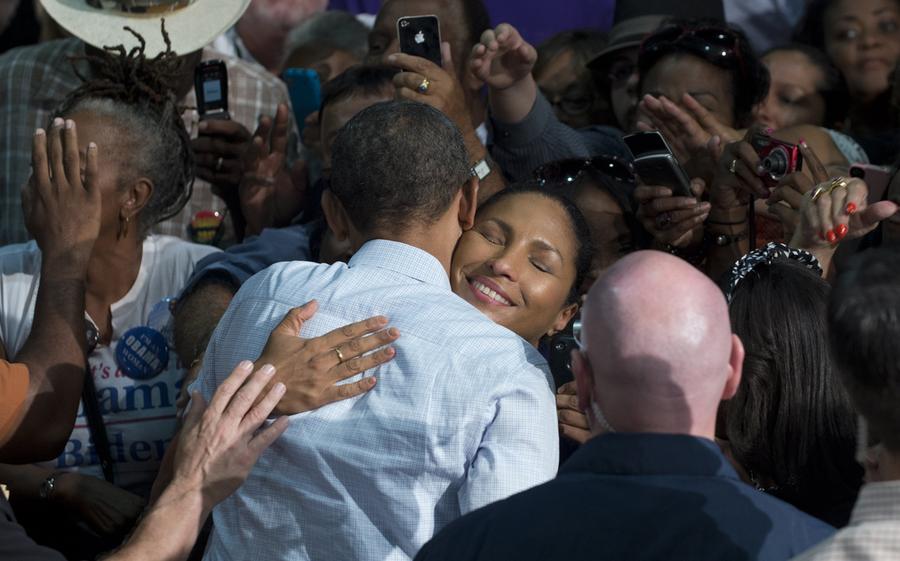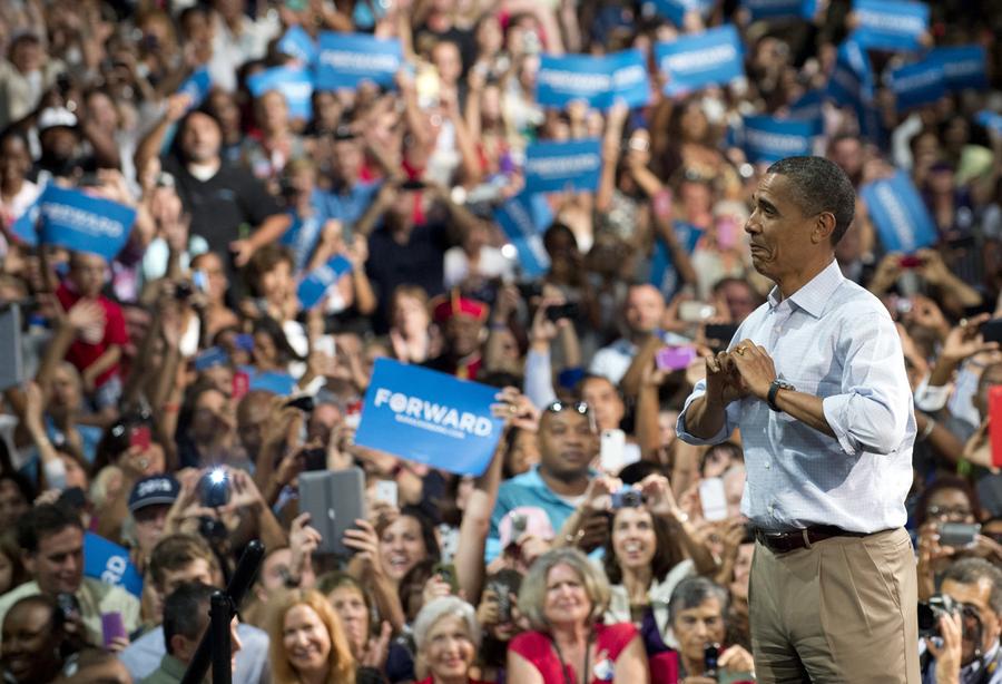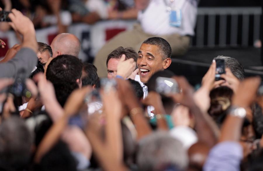Read moreBarack Obama makes a heart shape with his hands as he arrives to speak during a campaign event at the Palm Beach County Convention Center in West Palm Beach, Florida, on September 9, 2012. #