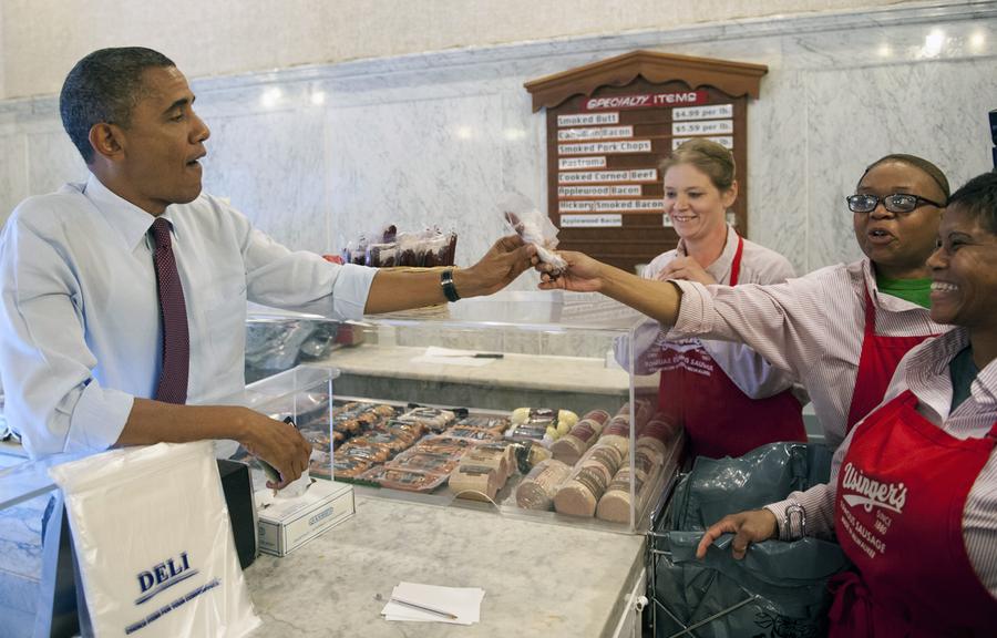 Read moreUS President Barack Obama takes a sausage sample during a visit to Usinger's Famous Sausage following campaign events in Milwaukee, Wisconsin, on September 22, 2012. #