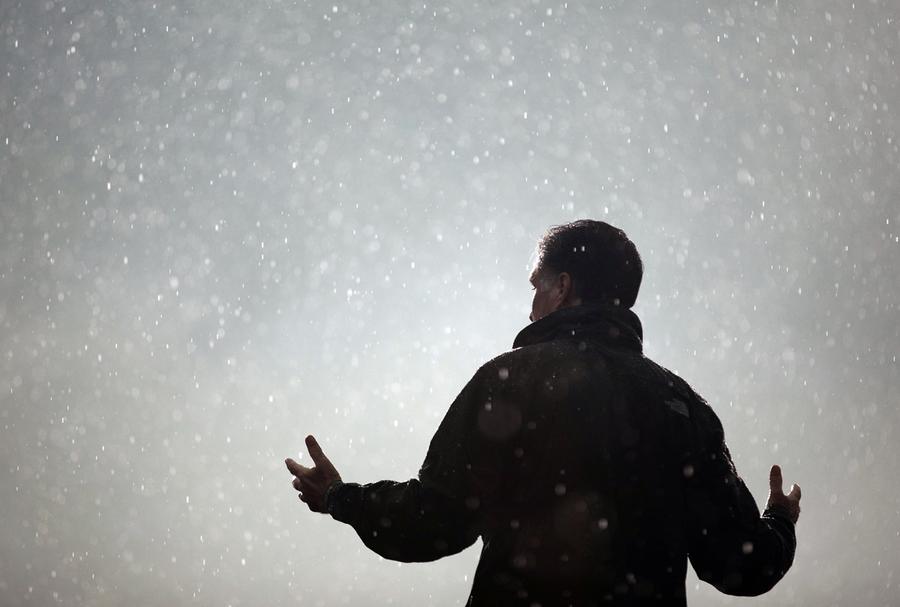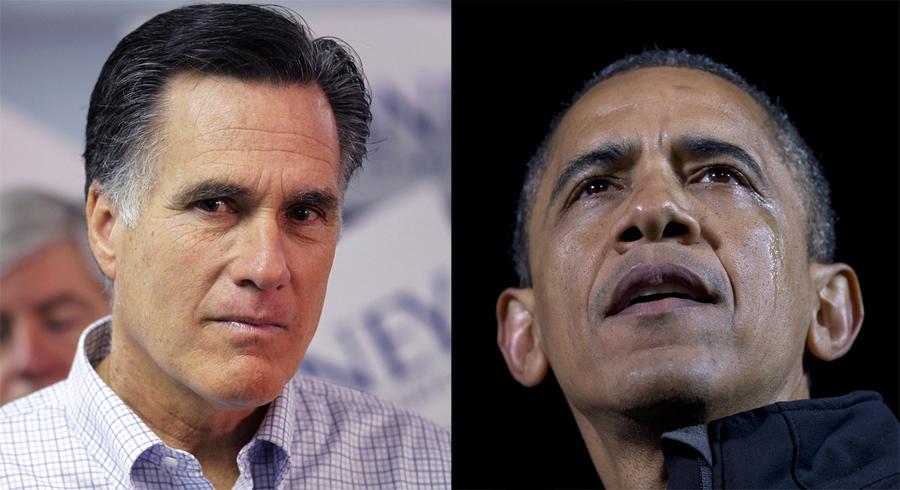 Read moreThe choice. At left, Republican presidential candidate, former Massachusetts Governor Mitt Romney, listens to a question from a reporter in Livonia, Michigan, on February 28, 2012. At right, President Barack Obama speaks as a tear streams down his face, at his final campaign stop, on November 5, 2012, in Des Moines, Iowa. #