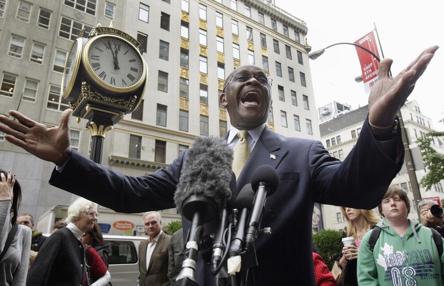 Read moreRepublican presidential candidate Herman Cain stops to address the media as he arrives for a meeting with developer Donald Trump, in New York, on October 3, 2011. He's a mathematician, a minister, a former radio talk show host and pizza magnate. But most of all, Herman Cain is a salesman. And how he sells. "The sleeping giant called 'we the people' has awakened," Cain thunders, pacing the stage in his trademark dark suit, brown fedora and "lucky" gold tie, delivering a rollicking, 45-minute performance that evokes an old-fashioned church revival, complete with cries of "Amen" from his audience. #