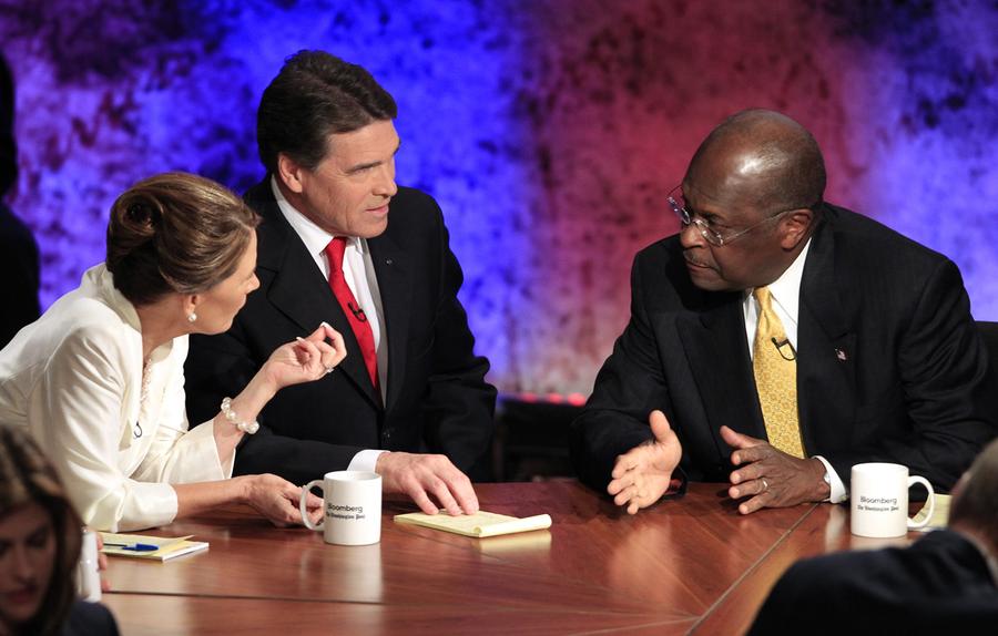 Read moreRepublican presidential hopefuls Rep. Michele Bachmann (R-MN), Texas Gov. Rick Perry and businessman Herman Cain talk during a break in their debate at Dartmouth College in Hanover, New Hampshire, on October 11, 2011. #