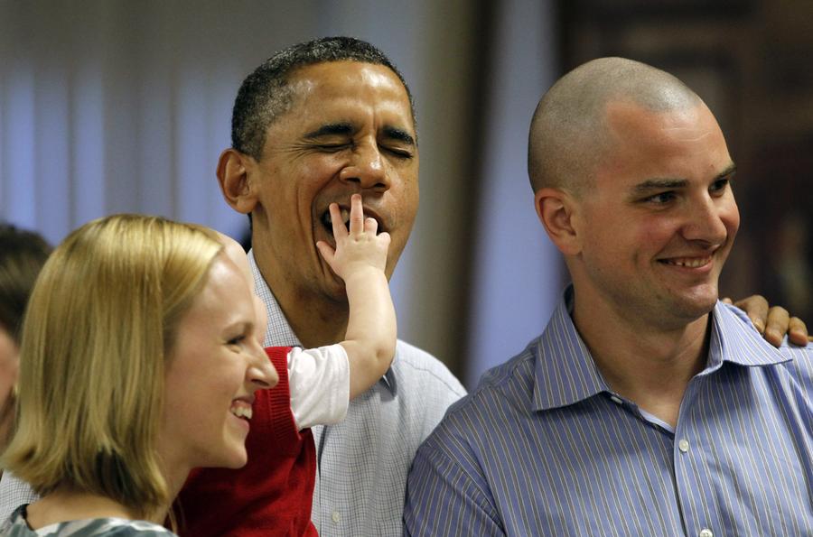 Read morePresident Barack Obama tries to evade the wandering fingers of 8-month-old Cooper Wall Wagner as he poses for a picture with his parents, Captain Greg Wagner and Meredith Wagner as Obama met U.S. Marines and their families having lunch at Kaneohe Bay Marine Corps base in Hawaii, on December 25, 2011. #