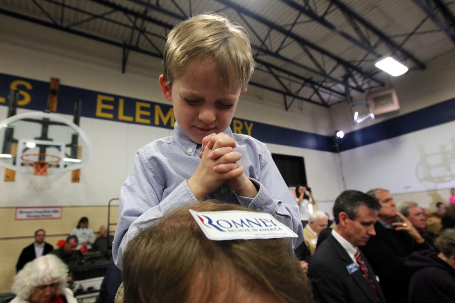 Read moreTrace Nystrom, 6, of Knoxville, sits on his father's shoulders and prays during the invocation before Republican presidential candidate, Mitt Romney speaks at a campaign rally at West Hills Elementary School in Knoxville, Tennessee, on March 4, 2012. #