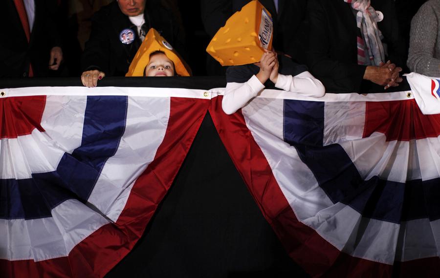 Read moreLuke Frank, 6, and his brother Zachary, 8, right, from Grafton, Wisconsin, wearing Romney cheesehead hats, listen as Mitt Romney campaigns at the Wisconsin Products Pavilion at State Fair Park in West Allis, Wisconsin, on November 2, 2012. #