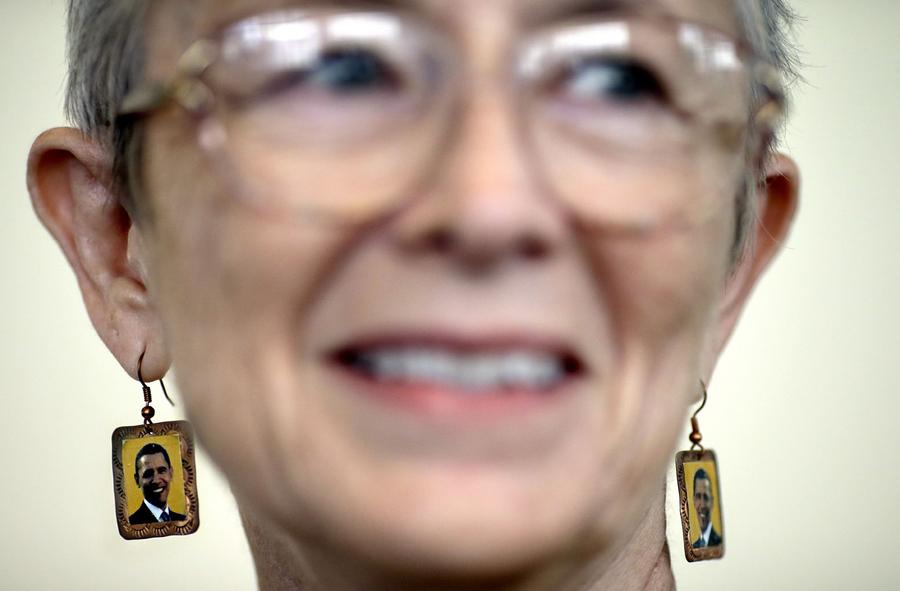Read moreDelegate Vickie Vogel of La Grange, Texas, wears earrings decorated with the image of President Barack Obama as she heads to a caucus to see first lady Michelle Obama speak in Charlotte, North Carolina, on September 5, 2012. #