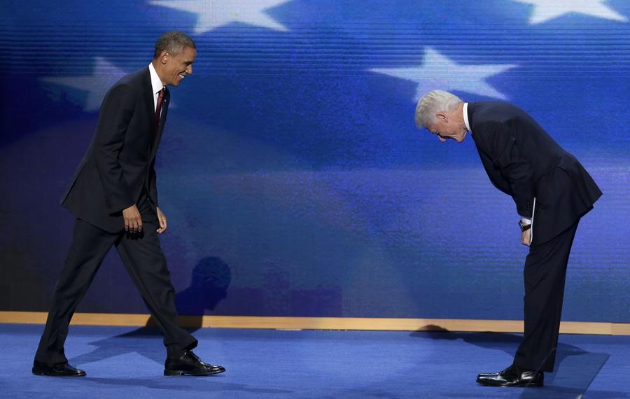 Read moreFormer President Bill Clinton bows as President Barack Obama walks on stage after Clinton's address to the Democratic National Convention in Charlotte, North Carolina, on September 5, 2012. #