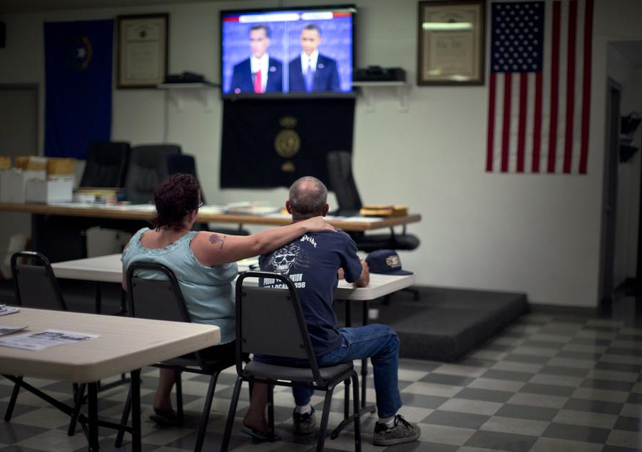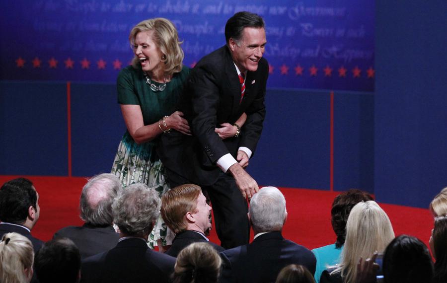 Read moreAnn Romney grabs her husband Mitt, as he greets members of the audience at the conclusion of the final U.S. presidential debate in Boca Raton, Florida, on October 22, 2012. #