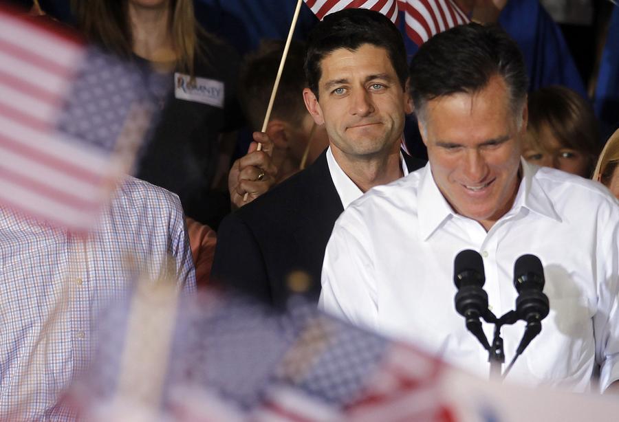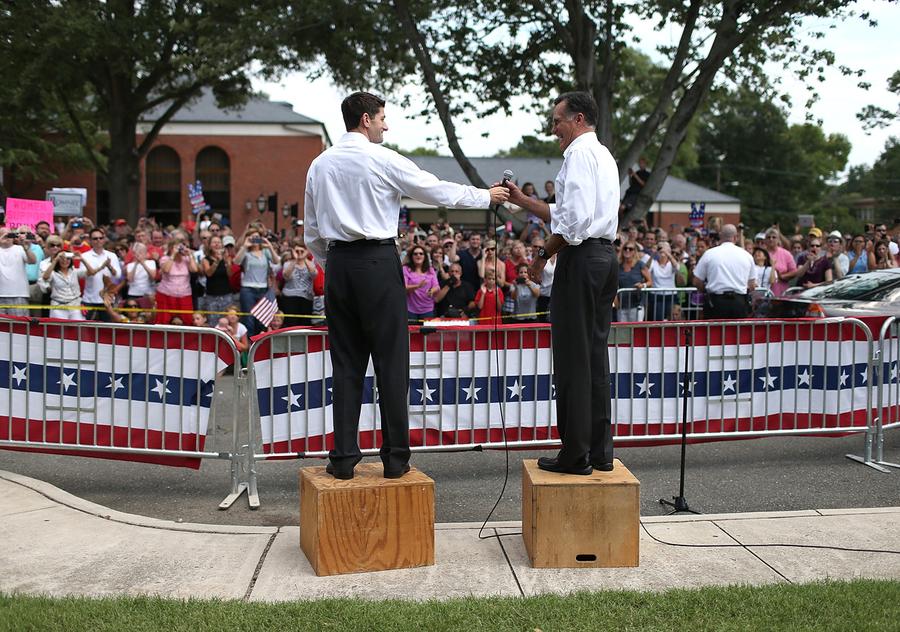 Read moreMitt Romney, with his newly announced vice presidential running mate, Paul Ryan standing behind him, during a campaign rally in Manassas, Virginia, on August 11, 2012. #