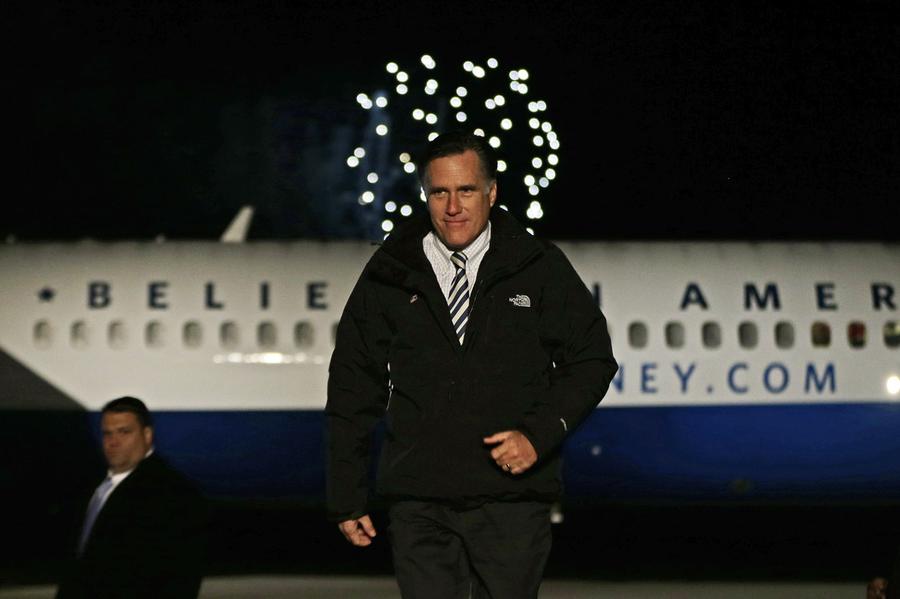 Read moreFireworks explode in the distance as Republican presidential candidate Mitt Romney walks on stage at a Virginia campaign rally at Newport News International Airport, in Newport News, Virginia, on November 4, 2012. #