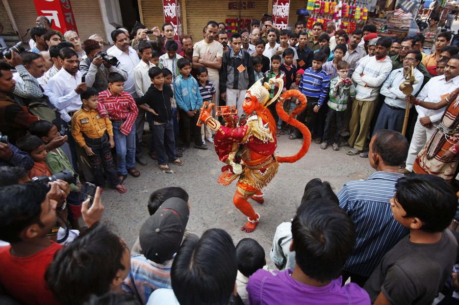 Read moreHindu priests perform rituals as devotees gather around an idol of monkey god Hanuman during Hanuman Jayanti festival in Allahabad, India, on November 12, 2012. Hanuman Jayanti commemorates the birth of Hanuman, which is celebrated in some parts of northern Indian ahead of Diwali. #