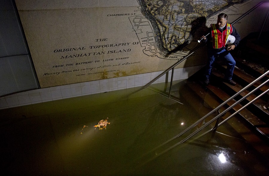 Read moreJoseph Leader, Metropolitan Transportation Authority Vice President and Chief Maintenance Officer, walks around massive fallen beams and other debris in the hurricane-damaged South Ferry 1 train station in New York, on October 31, 2012. Huge amounts of debris and as much as 20 feet of water filled the station and tunnel. #
