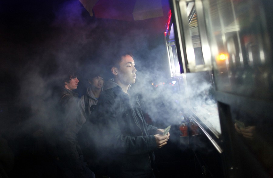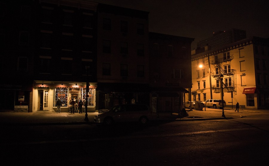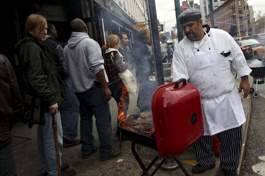 Read morePeople wait in line to purchase steaks while George Elizalde cooks the food on a grill in front of the Old Homestead Steakhouse in New York, on October 31, 2012. In lower Manhattan, some stores are open even though their power is still out. Others are busing essential employees to work. #