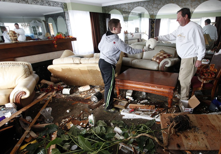 Read moreFreddie Nocella, Jr., left, hands a vase to his grandfather Bill Schmith, as Schmith works to salvage belongings from his heavily damaged home, on October 31, 2012, in Babylon Village, New York. #
