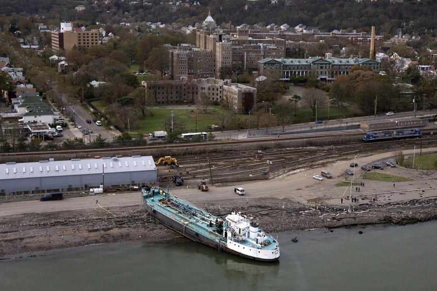 Read moreAn aerial photo shows the John B. Caddell, a 700-ton water tanker, grounded in New York, on October 31, 2012. The 167-foot tanker ran aground Monday night from the storm surge caused by Hurricane Sandy. #