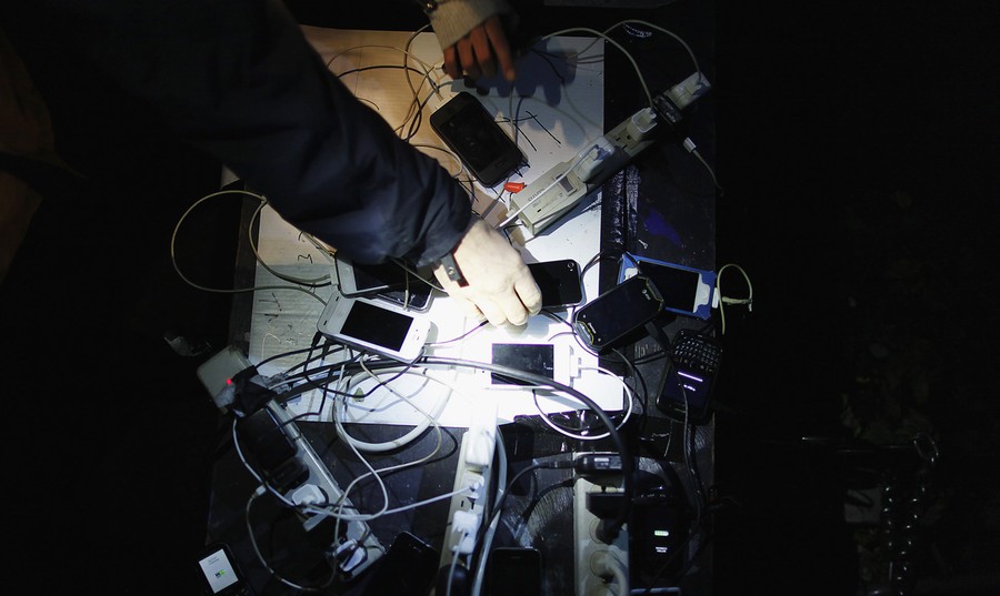 Read morePeople charge their cell phones at a generator supplied by a local theatre troupe in New York's Lower East Village in the aftermath of Hurricane Sandy, on October 31, 2012. The theatre set up a generator, power cords and a table for the community to charge their phones. #