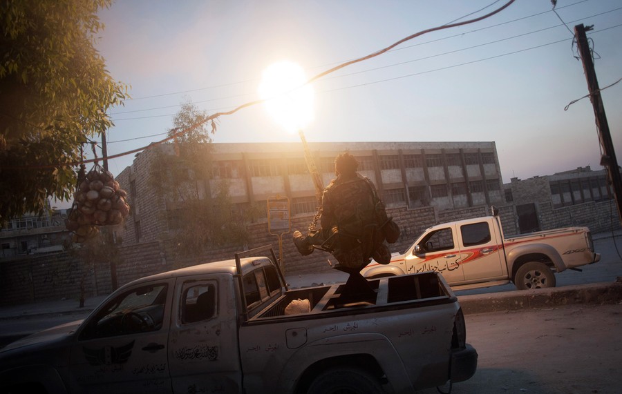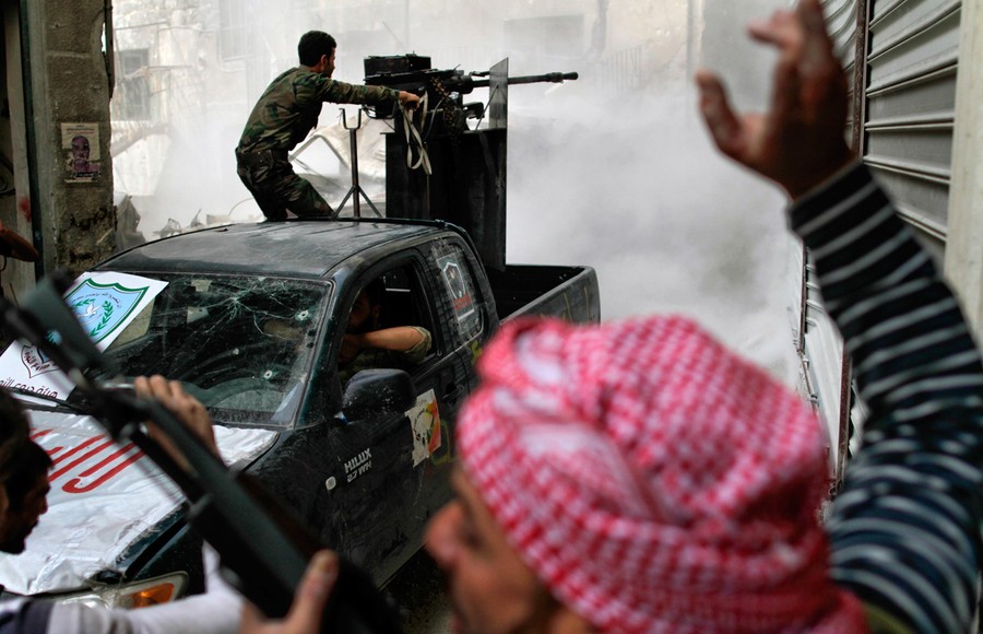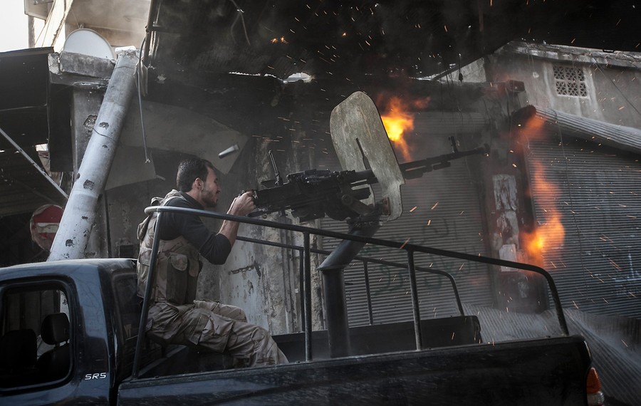 Read moreA rebel fighter fires a truck-mounted gun toward a building where Syrian troops loyal to President Bashar al-Assad are hiding during heavy clashes in the Jedida district, Aleppo, on November 4, 2012. #
