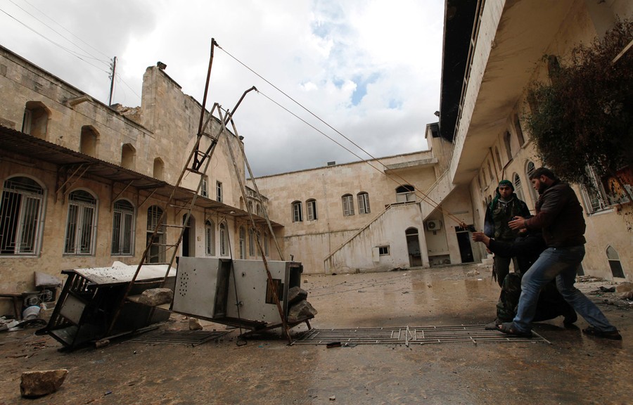 Read moreSyrian rebels prepare to launch a bomb using a homemade slingshot in the northern city of Aleppo, on October 16, 2012. Lightly armed Syrian rebels who face the warplanes, artillery and tanks of loyalists have turned to making their own weapons, even rigging a video game controller to fire mortar rounds. #