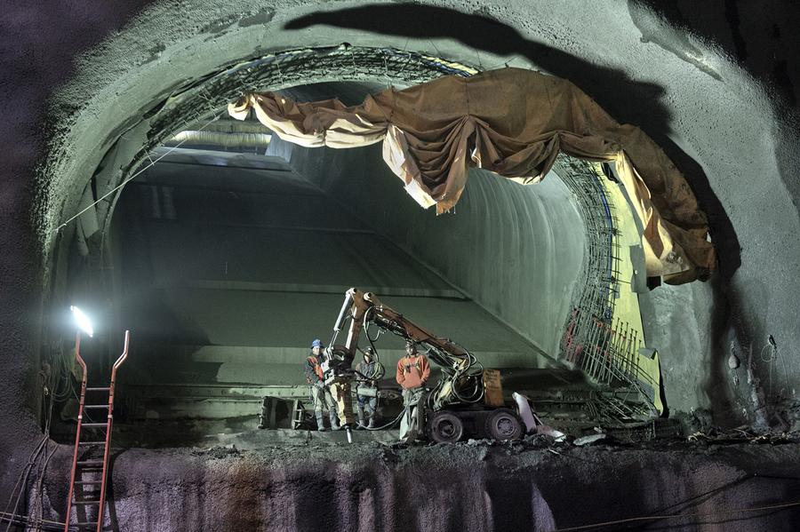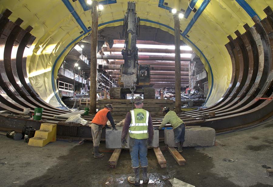 Read moreWork underway on one of the most challenging parts of the entire project -- excavating a tunnel under Northern Boulevard, while simultaneously supporting the overhead roadway, the overhead underground subway, and the elevated subway. To ensure stability, the tunnel was excavated in seven separate horizontal segments, or "drifts." And because the ground is soft at this site and difficult to control during excavation, it was frozen to allow for increased control and rigidity. Workers had to drive a new set of foundation pilings into the ground to temporarily support the elevated structure during construction. They then jacked up the line a fraction of an inch to shift the weight to the temporary supports, which you can see running vertically through the newly built tunnel. Those supports will be removed after the weight of the elevated subway is shifted back to the walls of the tunnel, which has been engineered to carry the load. Photographed on December 20, 2012. #