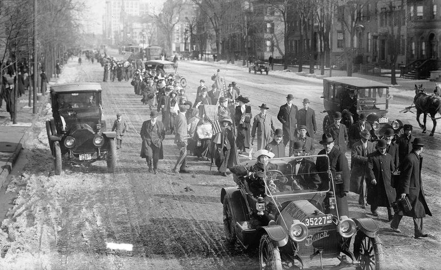 Read moreThe crowd surrounds and slows a Red Cross ambulance during the Women's suffrage procession, on March 3, 1913. Dozens of marchers were injured during the march, shoved and tripped by spectators. #