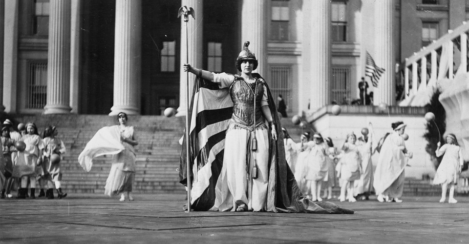 Read moreGerman actress Hedwig Reicher wears the costume of "Columbia" with other suffrage pageant participants standing in background in front of the Treasury Building in Washington, District of Columbia, on March 3, 1913. The performance was part of the larger Suffrage Parade of 1913. #