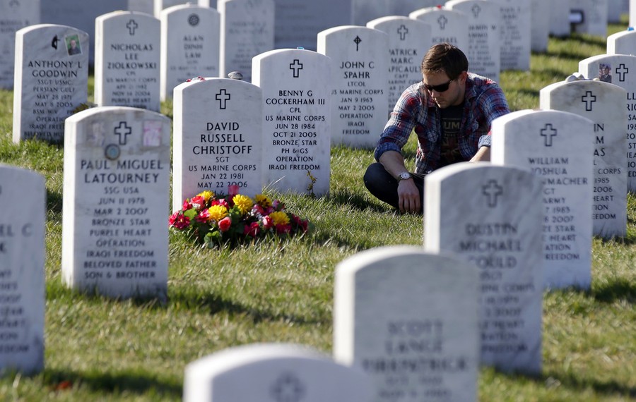Read moreRyan Lamke of Washington, sits by the grave of his fellow U.S. Marine, Cpl. Benny G. Cockerham III, in Section 60 of Arlington National Cemetery Tuesday, on March 19, 2013, in Arlington, Virginia. Lamke visits his friend's grave about once a month. Capt. Tyler Swisher, Navy Petty Officer 3rd Class Chris Thompson, and Marine Lance Cpl. Kenneth Butler also died with Cocherham when their Humvee was attacked by an improvised explosive device. #