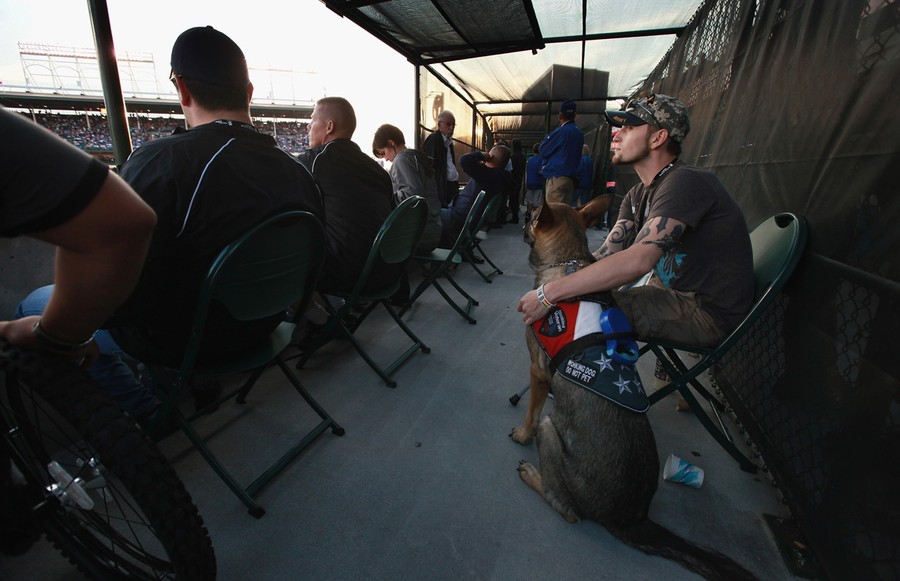 Read moreBrad Schwarz, with his service dog Panzer, attends a Chicago Cubs game with a group of veterans from the Wounded Warrior Project at Wrigley Field in Chicago, Illinois, on June 14, 2012. Schwarz uses Panzer to help him cope with post-traumatic stress disorder (PTSD) issues related to his 2008 tour in Iraq. In addition to suffering from PTSD Schwarz has memory loss related to Traumatic Brain Injury (TBI) and he must walk with a cane because of vertebrae and nerve damage in his back and legs. Ten days before he was scheduled to rotate home from a 15-month deployment in Iraq, his second, the Humvee in which he was riding was struck by an IED. Of the 5 soldiers riding in the vehicle, which caught fire after the explosion, Schwarz was the only one to survive. #