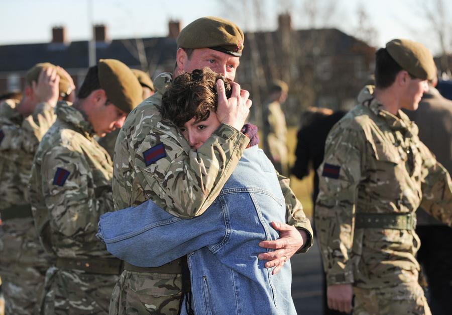 Read moreSoldiers from Headquarters Company 1st Battalion The Scots Guards return to their base at Bourlon Barracks and are reunited with their families following their recent deployment to Afghanistan on February 27, 2013 in Catterick, England. #