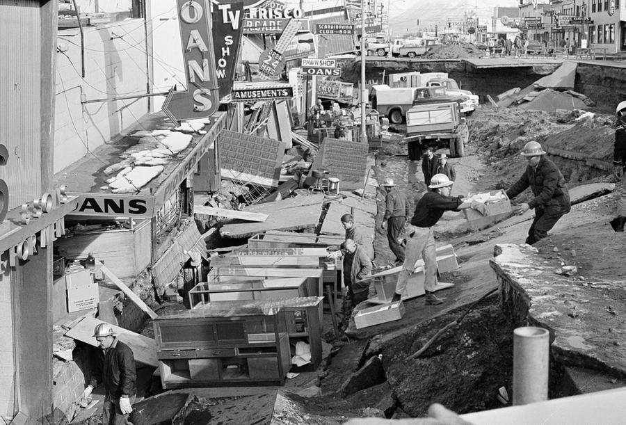 Read moreJosh Catalfo (@clubjosh) was looking for "any good hi res photos of the Good Friday Alaskan Quake from 1964." I found this one from the AP: Anchorage small business owners going full tilt clearing salvageable items and equipment from their earthquake-ravaged stores on shattered Fourth Avenue in Alaska, in the aftermath of the quake, on March 30, 1964. #