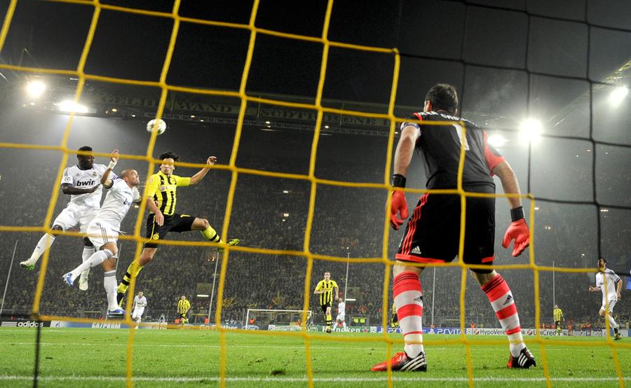 Read moreFabian (@owlborusse) said "My subject is Westfalenstadion / Borussia Dortmund!" Here, Real Madrid's Ghanaian midfielder Michael Essien (left), teammate Pepe (2nd left) and Dortmund's defender Mats Hummels (2nd R) contest a header watched by Real Madrid's goalkeeper and captain Iker Casillas (right) during the UEFA Champions league group D football match between Borussia Dortmund and Real Madrid in Dortmund, Germany on October 24, 2012. Dortmund defeated Real Madrid 2-1. #