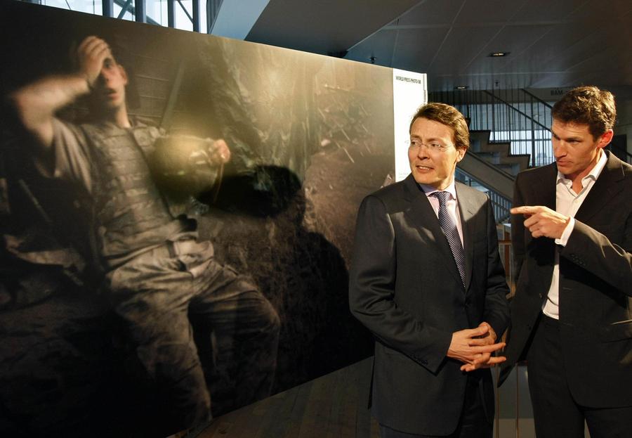Read moreSimon Klingert (@simon_klingert) suggested "one photo by Tim Hetherington & Chris Hondros each to commemorate their lives and outstanding work." Great idea. Here, Winner of the World Press Photo of the Year, Tim Hetherington (right) shows Prince Constantijn of the Netherlands his winning photo of a US soldier of the 503rd Infantry Regiment taken in Afghanistan, in Amsterdam on April 27, 2008. Both Tim and photographer Chris Hondros were killed in an attack during the Libyan Civil War, on April 20, 2011. #