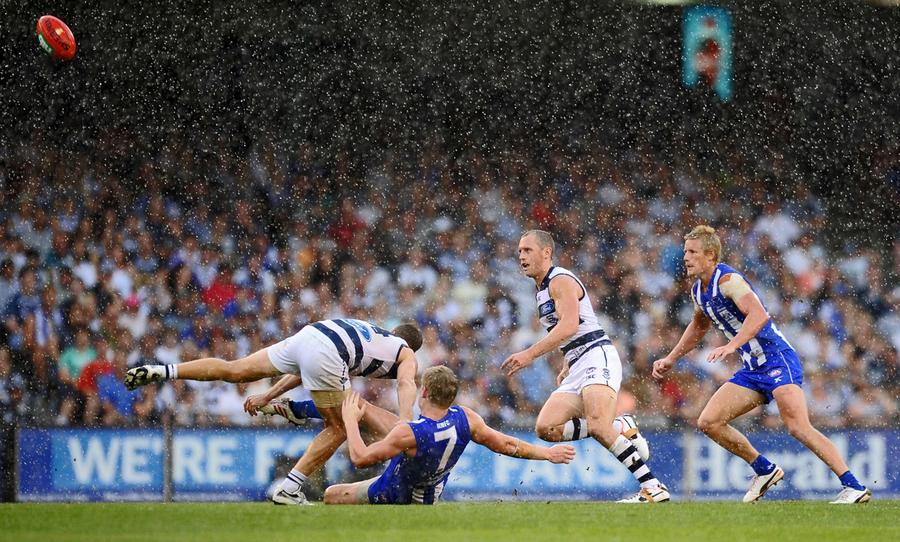 Read moreDennis (@Watje5) said "I would like to see a picture of sports during heavy rain". Jack Ziebell of the Kangaroos gets his kick away in the pouring rain during the round two Australian Football League match between the Geelong Cats and the North Melbourne Kangaroos at Etihad Stadium on April 7, 2013 in Melbourne, Australia. #