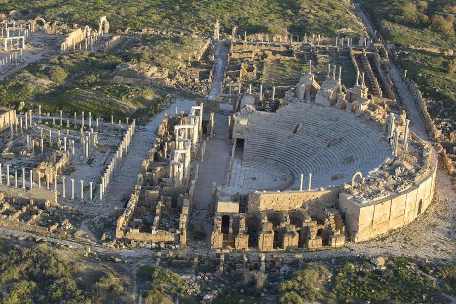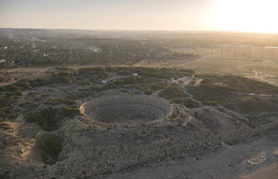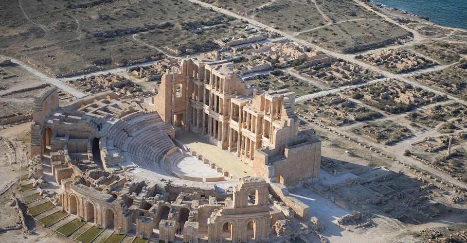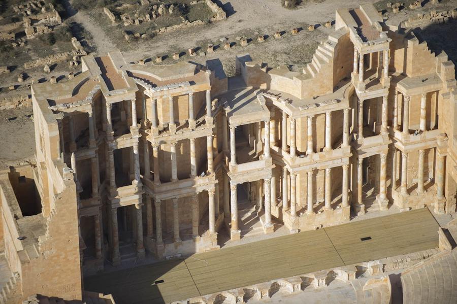 Read moreAerial view of the almost intact ancient Sabratha Theatre located in Sabratha, Libya, on the Mediterranean coast. The site was originally a Phoenician trading-post, but became part of the Roman Empire, and its monuments were built in the 2nd and 3rd centuries AD. View on Google Maps. #