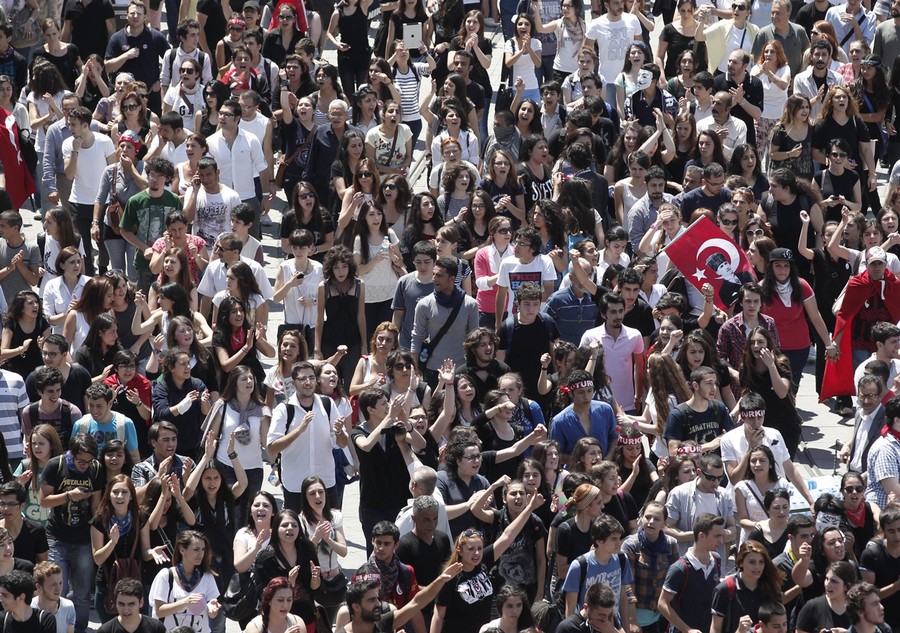 Read moreProtesters raise their hands as they shout slogans during a protest at Taksim Square in Istanbul, on June 3, 2013. #