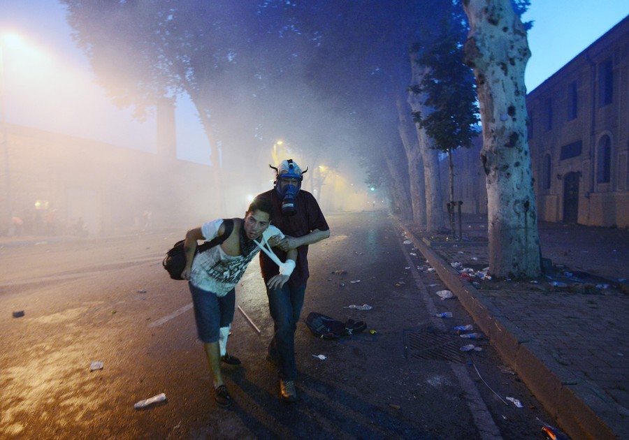 Read moreAn injured man is helped as Turkish protesters clash with riot police near the former Ottoman palace, Dolmabahce, where Turkey's Prime Minister Erdogan maintains an office in Istanbul, late Saturday, June 1, 2013. #