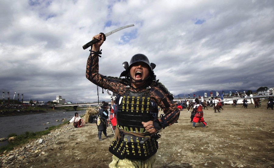 Read moreA man dressed as a samurai warrior screams while charging enemy fighters during a reenactment of the Battle of Kawanakajima, which was fought in the mid 16th century, in Fuefuki, Yamanashi Prefecture, northeast of Tokyo, Japan, on April 21, 2013. Every April participants hold a reenactment to mark the harshest of a series of five battles between two famous warlords, Kenshin Uesugi and Shingen Takeda. #