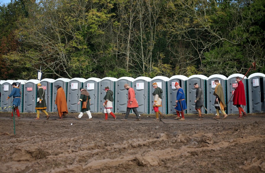 Read moreMembers of historical reenactment groups walk past a row of portable toilets prior to the annual reenactment of the Battle of Hastings in Battle, England, on October 14, 2012. #