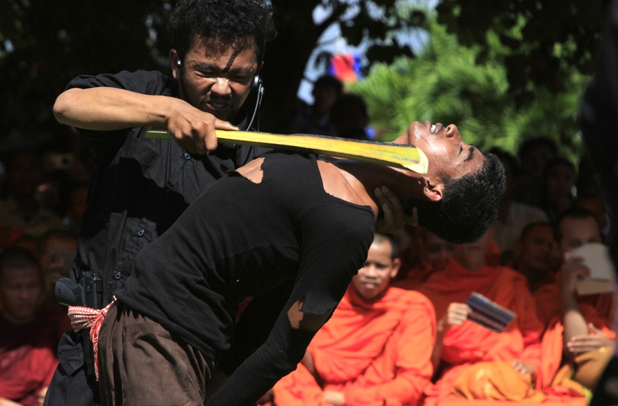 Read moreCambodian students re-enact torture executed by the Khmer Rouge during their reign of terror in the 1970s to mark the annual "Day of Anger" at Choeung Ek, a former Khmer Rouge "Killing Field" dotted with mass graves, Phnom Penh, Cambodia, on May 20, 2013. Cambodian Buddhist monks, nuns, civil servants, students attend the annual "Day of Anger" events to remember the atrocities and killings committed under the Khmer Rouge's 1975-79 rule. #