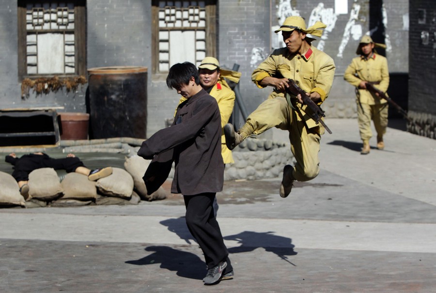Read moreAn actor dressed as a Japanese military soldier jumps and kicks a man acting as a villager during a performance at the Eighth Route Army Culture Park, one of two theme parks, in Wuxiang county, north China's Shanxi province, on October 20, 2012. Visitors to the theme parks pay to participate in a dress up action play with performers, where they can choose to role play as soldiers from the Japanese army or the Eighth Route Army, with professional sound and lighting effects. A live-action show and the parks, located near the former headquarters of the Eighth Route Army, a military group controlled by the Communist Party of China during the Chinese Civil War and the Second Sino-Japanese War, cost the Wuxiang government around 500 million RMB ($80 million) to construct. #