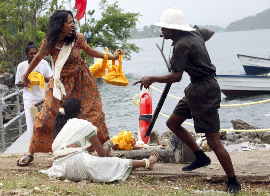 Read moreActors and actresses from Iere Theatre Productions play the roles of indentured East Indian laborers and British constabulary police (right), during a reenactment of the first arrival of East Indians to Trinidad and Tobago organized by the Ministry of National Diversity and Social Integration to mark Indian Arrival Day, on Nelson Island in the Gulf of Paria off the west coast of Trinidad, on May 25, 2013. Indian Arrival Day is a national holiday and is celebrated on May 30 every year. #
