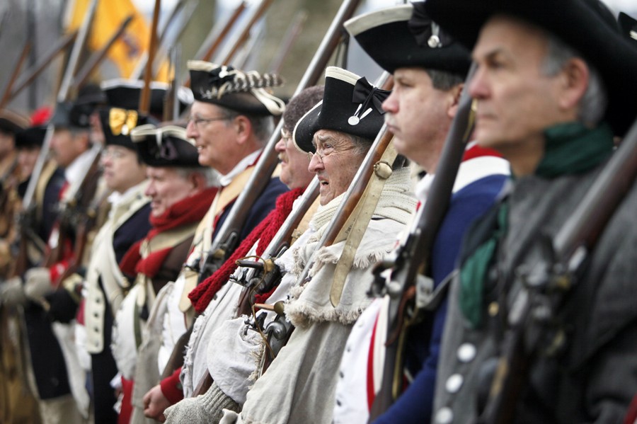 Read moreRevolutionary War reenactors stand at attention during a reenactment of Washington crossing the Delaware River, on December 25, 2012, in Washington Crossing, Pennsylvania. #