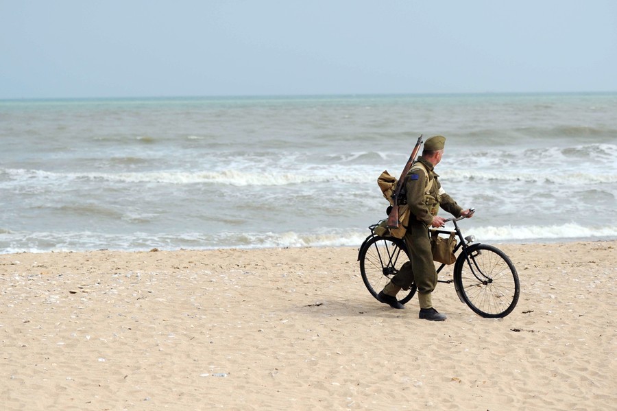 Read moreA man dressed as a World War II soldier walks with a bicycle along Juno Beach in Courseulles-sur-Mer, on June 6, 2013, during the commemoration of the 69th anniversary of the D-Day landing in Normandy. #